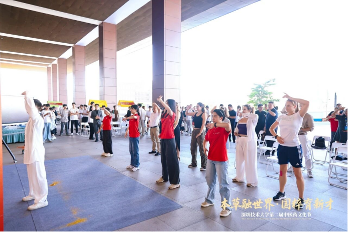 现场师生嘉宾一起练习八段锦,释放工作学习的压力,舒展身体,调节身心,共同感受中华传统文化和民族传统体育项目的巨大魅力。