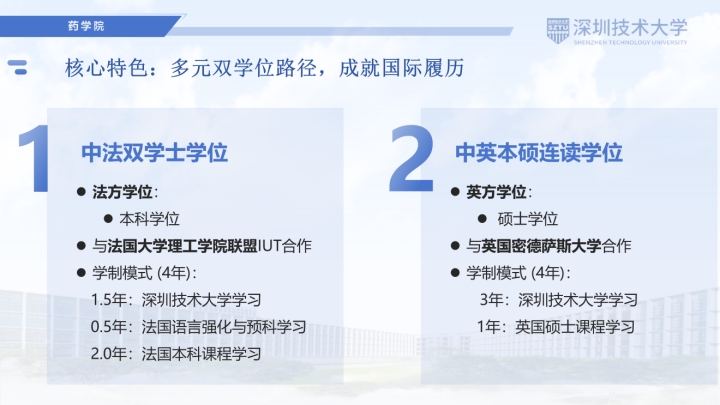 1. 多元境外学习通道:整合中法双学位、中英本硕连读、国际交流等资源,满足你的个性化发展需求;